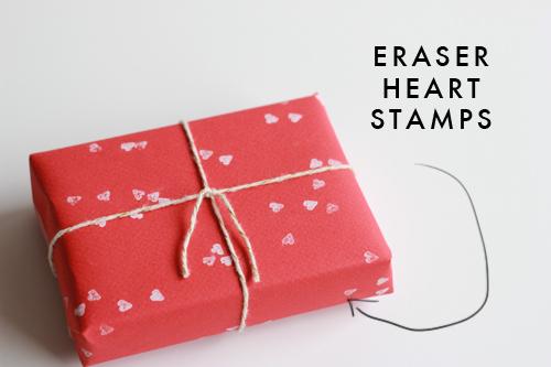 Estas dos formas son también super sencillas y muy originales (sobre todo la primera) y las podéis encontrar ambas en la web de thehousethatlarsbuilt. Os podéis imaginar como se hacen. Para el primer paquete necesitarás papel de embalar corriente al que le dibujarás una serie de corazones, después con un cúter recortaremos solo la mitad del corazón y lo doblamos hacia afuera (dejaremos cara en la que hemos dibujado el lápiz hacia adentro para que no se vea feote). Ahora con un poco de pegamento pegamos por dentro unas tiritas de algun papel bonito y 1a envolver! Para el segundo fabricaremos un sello con la goma de un lápiz con forma de corazón y lo estamparemos como más nos guste a modo de estampado. Los colores son a vuestra elección, pero en San Valentín el rojo no puede faltar