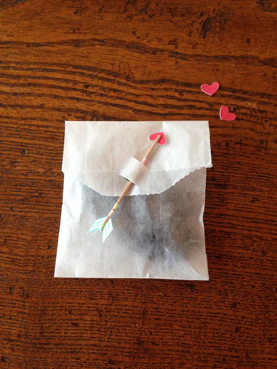El sobre no es que me mate, pero la idea de la flecha me parece ideal. Puedes fabricarla con un poco de cartulina y palillos y pegarla en la superficie de tu paquete. Las flechas de cupido vuelan hacia ti!!