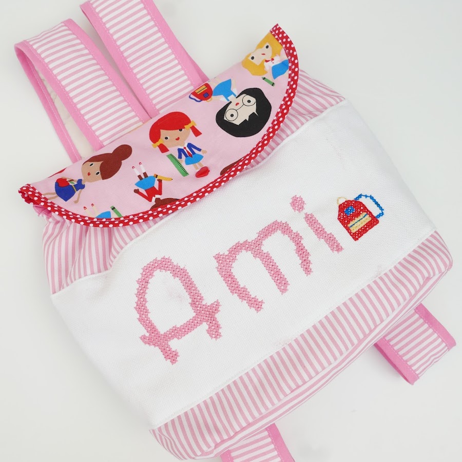 Letras de cruceta: Muy fácil de hacer siguiendo el gráfico de un abecedario que te guste, en el caso de esta mochila utilicé uno de los abecedarios que puedes encontrar en este blog. Ah! un detalle, la mochila de la derecha está tomada de los dibujos del estampado.