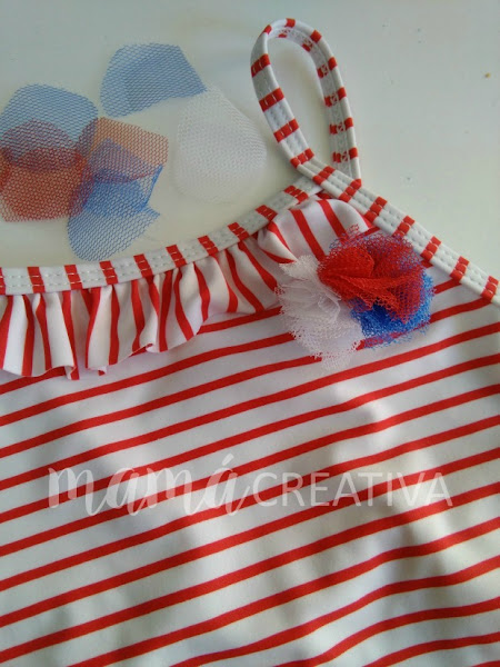 En estos casos he usado tela de tul para hacer unos pequeños adornos para la decoración del bañador, pero hay un montón de formas más, con fieltro, lazo, piculina, etc.