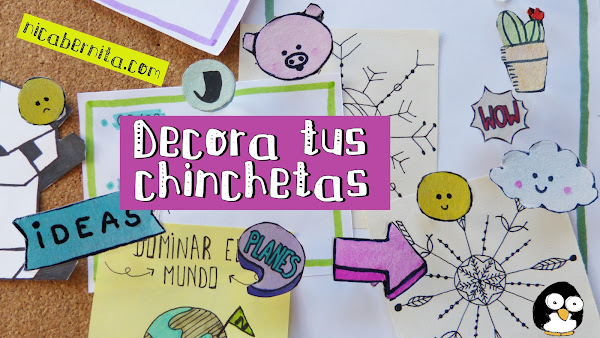 Para crear las decoraciones de las chinchetas he utilizado cartón reciclado, pero si lo prefieres puedes emplear cartulina. Los dibujos los he realizado con una combinación de rotuladores y acuarelas. Si quieres ver el paso a paso de su elaboración, no te pierdas el vídeo: