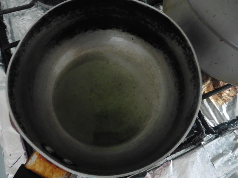 En una olla colocamos aceite y lo calentamos, al aceite le agregamos unas gotas de colorante verde.