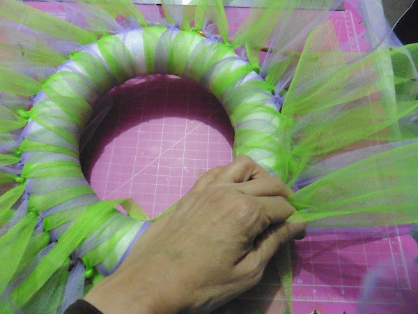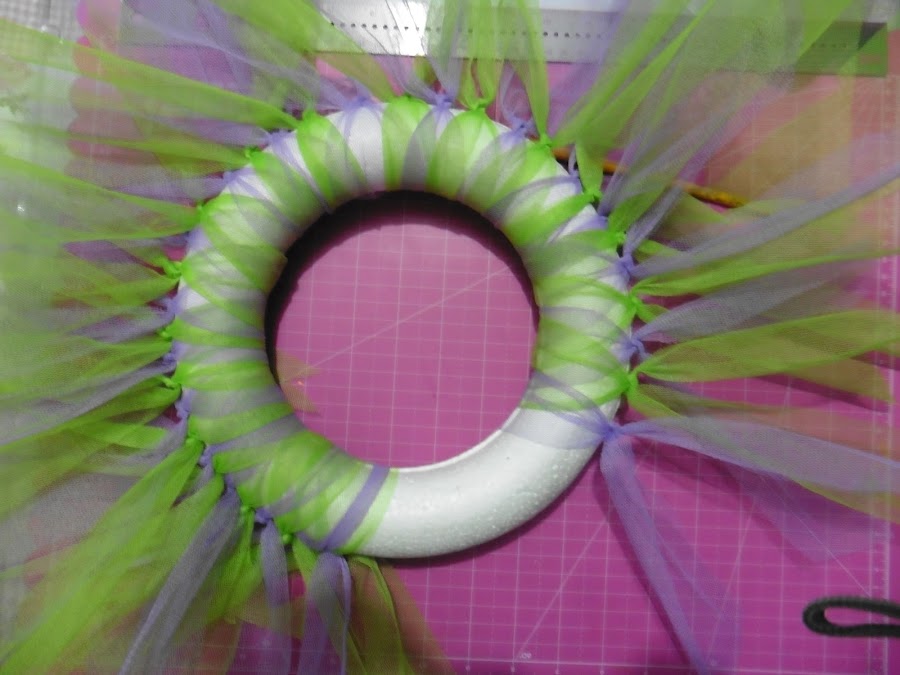 Para la corona vamos a necesitar un aro de tecnopor o anime y tiras de tull de 50 cm de largo por 8 de ancho, observa en la foto como voy amarrando las tiras de tull alrededor del aro, esta es una actividad que puedes hacer junto con los niños y de esta forma enseñarles los colores y la secuencia de los mismos.