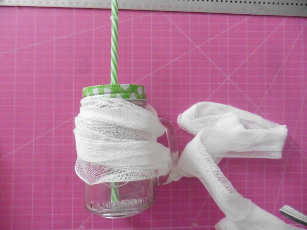 Envolvemos el envase de vidrio con la gasa imitando una momia, abrimos la gasa dejando ver el vidrio o el contenido del envase.