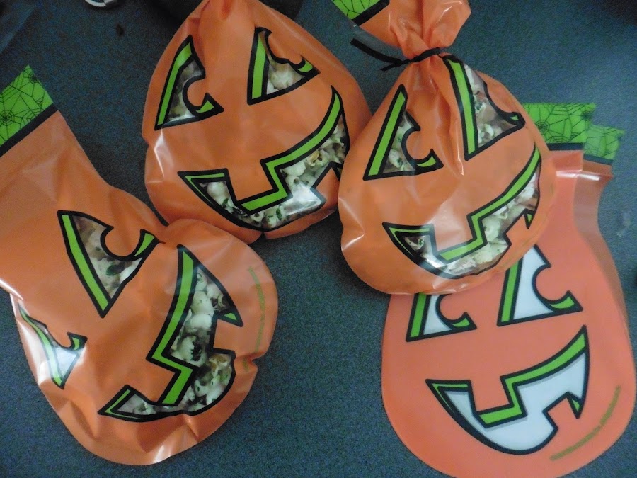 Por ultimo colocamos nuestras cotufas verdes tipo zombie jijiji en bolsitas decoradas con motivos de halloween, en este caso son unas calabazas bien divertidas.