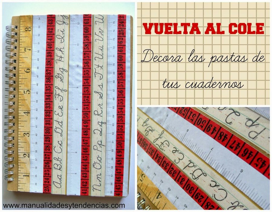 El blog Manualidades y tendencias nos sugiere decorar nuestras libretas utilizando papel de scrapbook, cinta métrica de papel y washi tape, Con esta combinación colocada en tiras podemos darle a nuestros cuadernos un toque vintage tardando muy poquito tiempo. Si no tienes todos estos materiales o no quieres comprarlos puedes llevar a cabo esta manualidad con lo que dispongas, sólo la cinta o sólo washi tape, etc. Es una labor sencilla en la que incluso los más pequeños pueden ayudar. En su blog además podrás encontrar unas etiquetas imprimibles para ponerle el nombre y la materia a los cuadernos.
