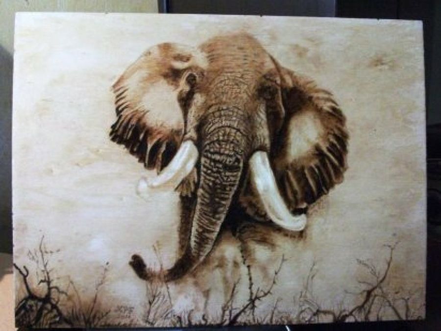 El amigo Notengocamjoe ha optado por la técnica de la pirografía. Con ella, podremos crear con poco esfuerzo y de manera más breve nuestra propia obra maestra. En este caso ha hecho un elefante de lo más realista, el cual parece salirse del marco.