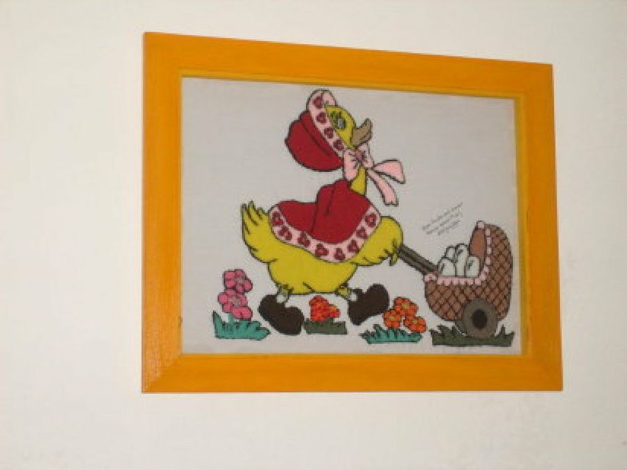Igualmente, las paredes pueden ser adornadas con cuadros. En muchos centros comerciales encontraremos distintas ofertas que no tienen por qué satisfacer nuestros gustos. Por ello, es mucho más aconsejable y económico fabricarlos nosotras mismas con un poco de paciencia.Aunque parezca increíble, este hermoso cuadro no está pintado, sino que está bordado, concretamente con bordado chino. El resultado final es una colorida obra con dibujos infantiles. Está hecho por la usuaria Alerisso, quien también ha añadido un mensaje escrito.