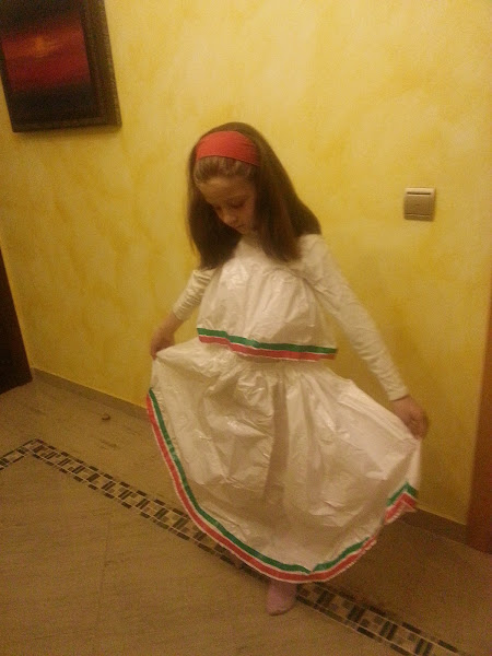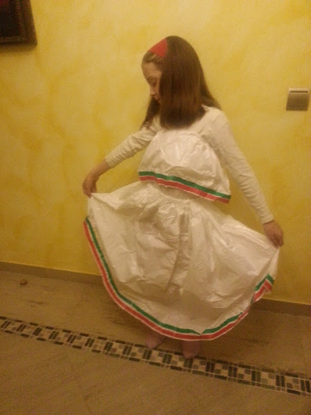 Este otro traje representa el traje regional de la mujer mexicana. Los remates de color verde y rojo se hacen pegando cinta aislante de esos colores.
