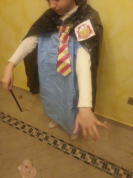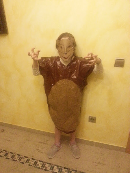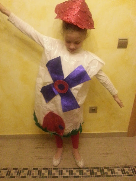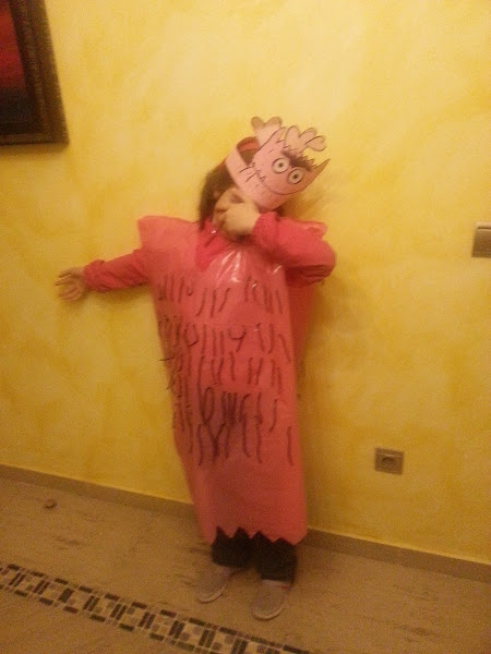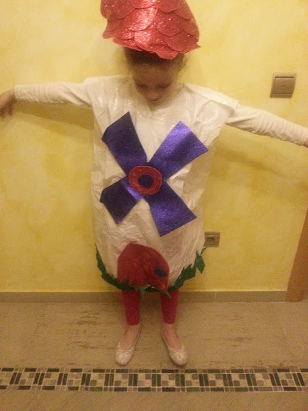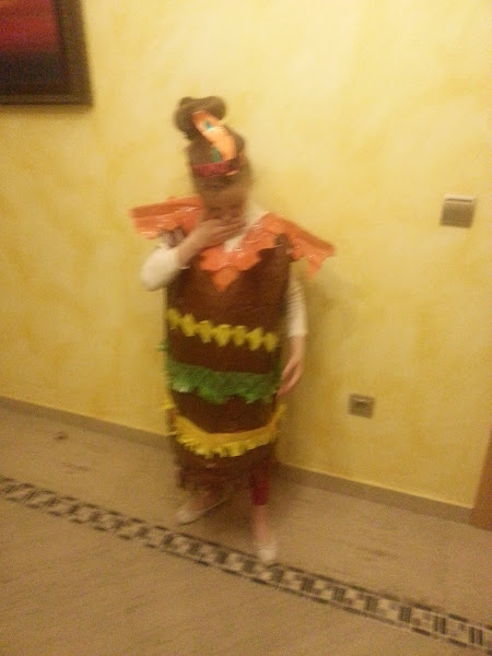 Este es el traje que lucirán mañana en el desfile del cole, trata sobre la temática de los monstruos que muestran las emociones, este que tiene la modelo representa la felicidad.