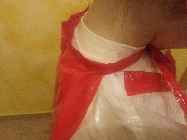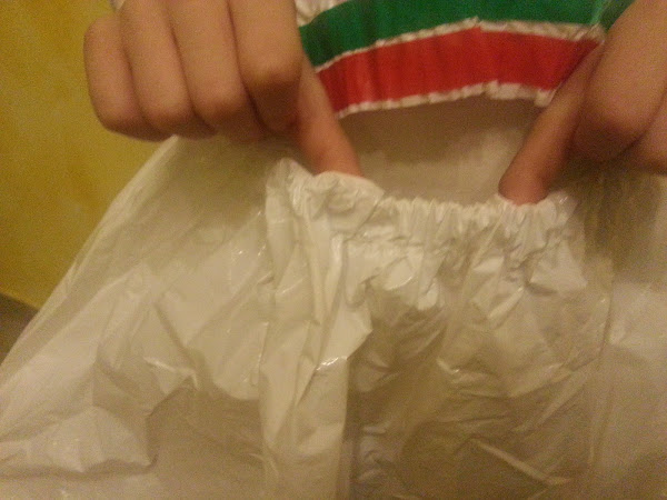 Para que ajusten tanto el corpiño como la falda se hace una cabecilla cosida a mano en la bolsa de plástico por la que pasamos una goma.