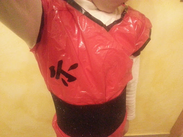 Este otro modelo de temática medieval, se hace con bolsas de plástico y sobre el pecho se pega una flor de lis hecha con papel charól de color rojo. El reborde del cuello de bolsa de plástico se pega con pegamento.