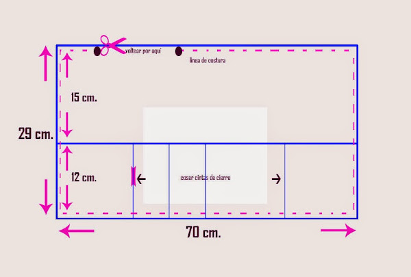 Cierra la abertura y dobla el rectángulo a lo largo según la altura del patrón . Cierra los bordes exteriores y en el centro cose la linea que forma el primer bolsillo. Forma los otros bolsillos cosiendo de nuevo en el centro de los dos bolsillos.En el que elijas vuelve a cose a la mitad para hacer dos compartimentos más estrechos.