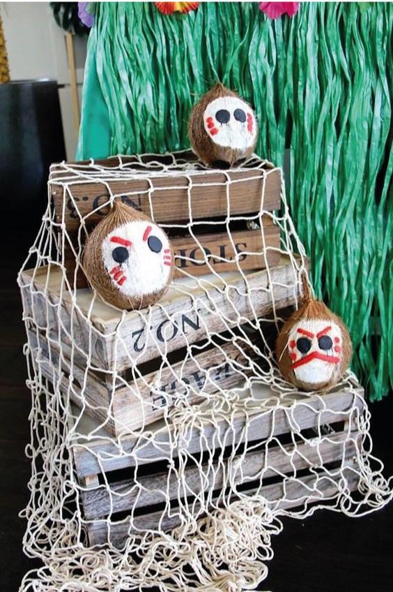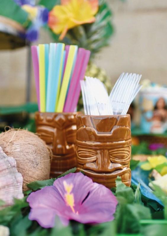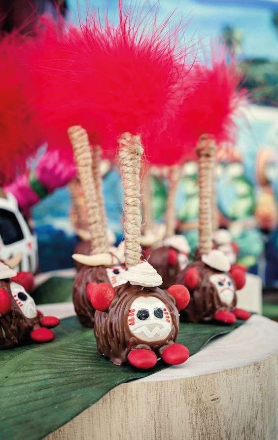 Elementos marinos como estrellas de mar, caracolas y para simular la arena de la playa, puedes utilizar azúcar rubia. Y finalmente, cerrarán la decoración objetos como talismanes, y el gancho de Maui. Cocos decorados o pintados con las caras de los Kakamora e imágenes de los demás personajes de la película.