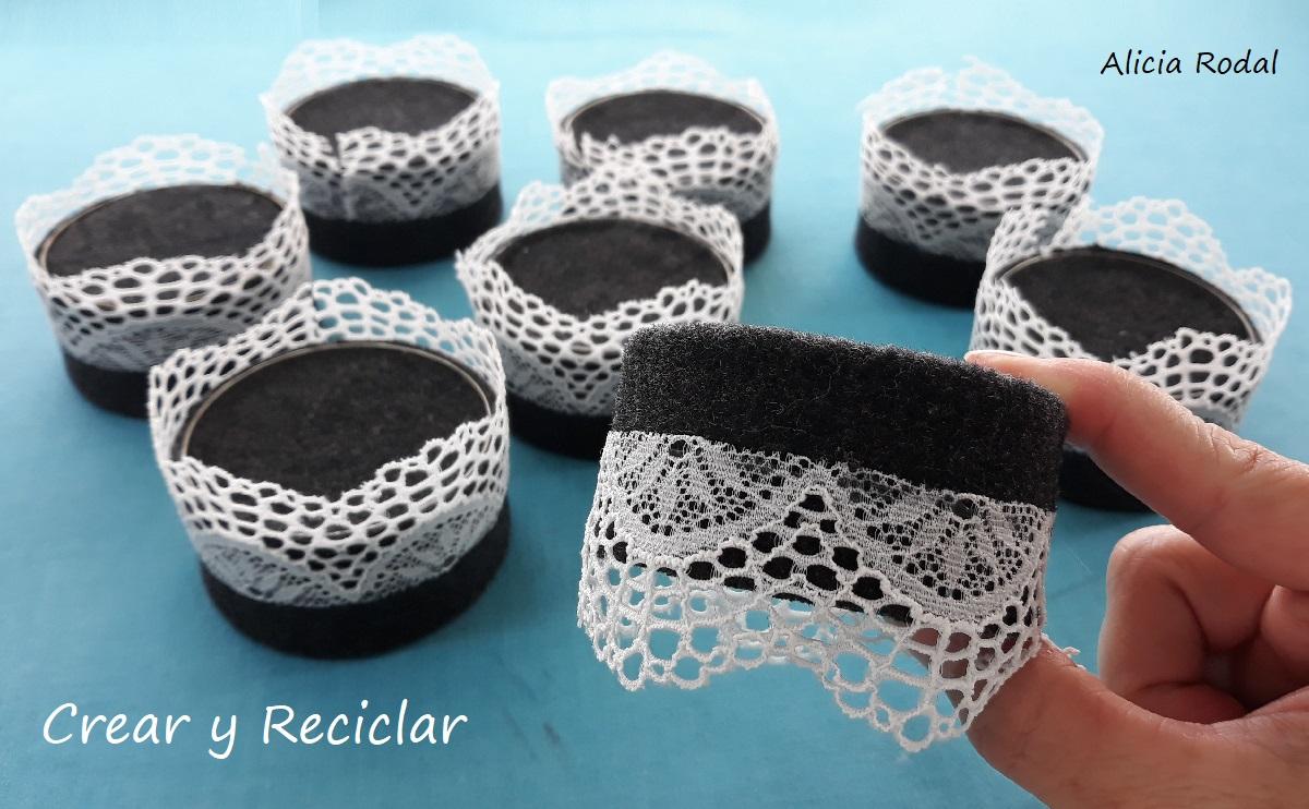 Ahora viene la parte que puede parecer decorativa, pero no lo es.Vamos a pegar una cinta de encaje por todo el borde de las latas, pero dejando la parte más calada o con más hueco por debajo del nivel de la lata, es decir que sobresalga.