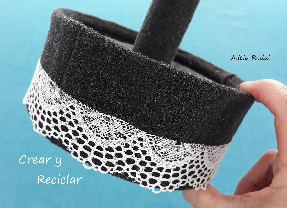 Te recomiendo que quede forrado por debajo, aunque sea con el doblez de la tela, porque así evitas que la lata se oxide o que te pueda rayar la superficie de la mesa donde vayas a poner el organizador.