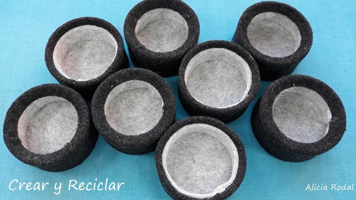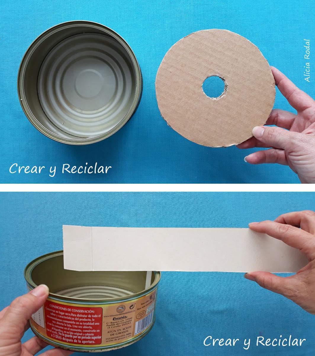 Si forramos estas piezas de cartón primero y luego las pegamos a la lata por dentro, será mucho más sencillo de hacer, pero si quieres también puedes forrar con a tela directamente, o usar otro tipo de materiales, como fieltro, cartón, papel adhesivo, cartulina, goma eva o foamy, etc. Como tú ya sabes a mí me gusta reutilizar.