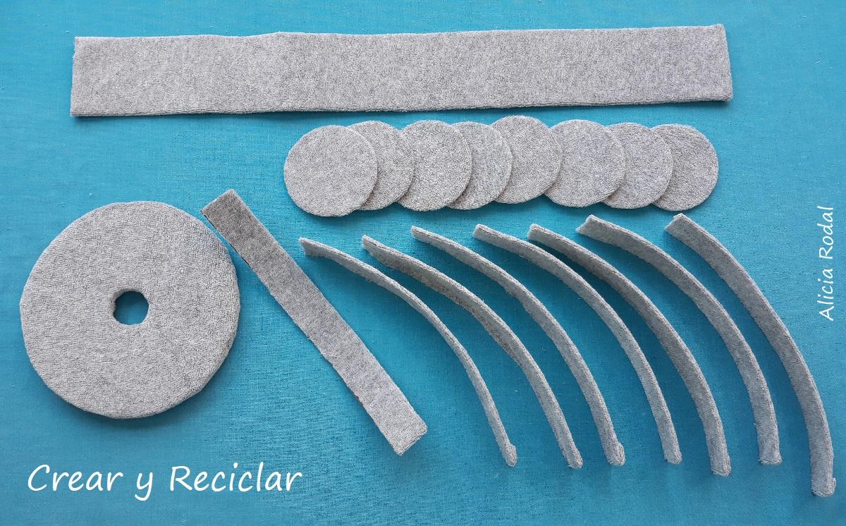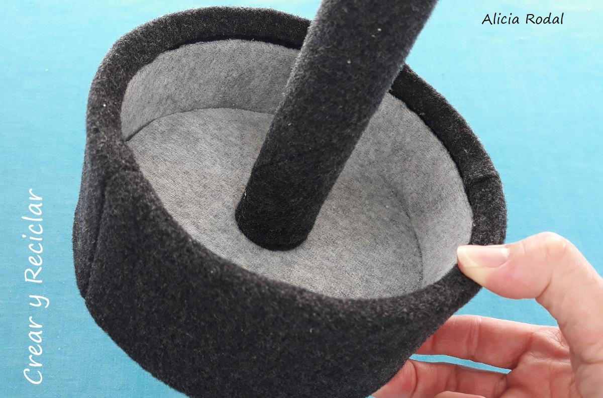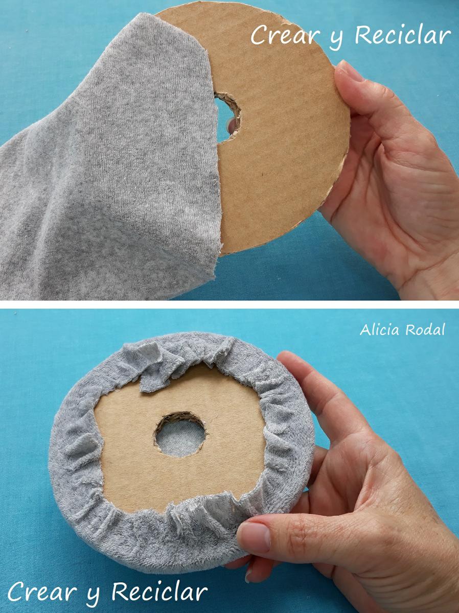 Para forrar el cartón voy a reutilizar una tela de algodón color gris tipo franela gruesa, que era de un pantalón de chándal o pantalón deportivo de mi hija que estaba roto y manchado, pero que se puede aprovechar.Forramos todo el círculo de esta forma: