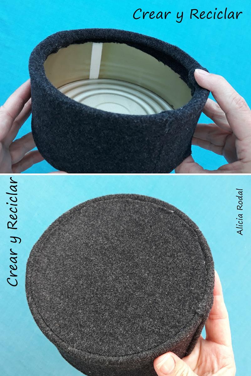 Con la tela gruesa color negro forramos las latas por fuera. Pegamos la tela por el lateral de la lata, dejando suficiente tela por la parte de arriba, como 1 o 2 centímetros y como medio centímetro por debajo.Luego, doblamos la tela hacia adentro de la lata y la pegamos. Hacemos lo mismo con la parte de abajo, doblamos y pegamos la tela.