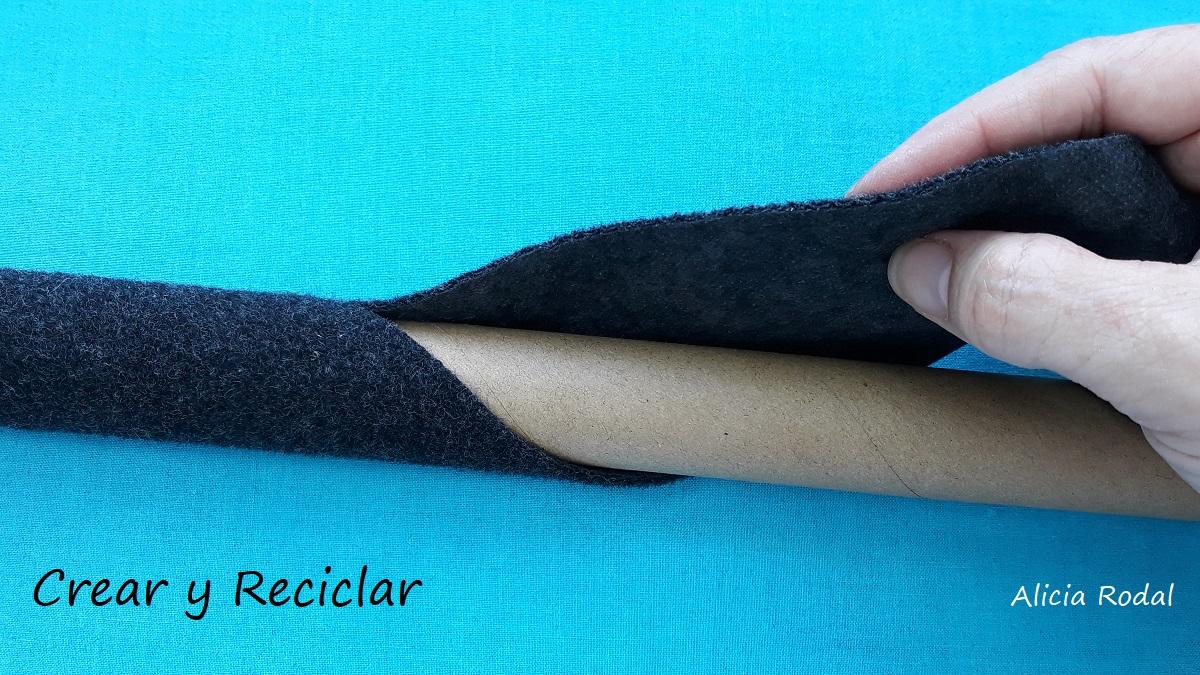 También tenemos que forrar el tubo de cartón largo y grueso. Este tipo de tubo de cartón es de un rollo de papel un poco más largo de lo normal, tipo industrial. Si vas a usar un rollo de cartón de papel de cocina convencional, te recomiendo que pegues varios, para que quede más largo y más grueso, como el que yo usé.Para forrar el tubo debes cortar una tira de la misma tela negra y pegarla en forma de espiral, así es más fácil y el acabado queda muy limpio. Vamos dando vueltas a la tela alrededor del tubo y lo vamos pegando, uniendo las telas.