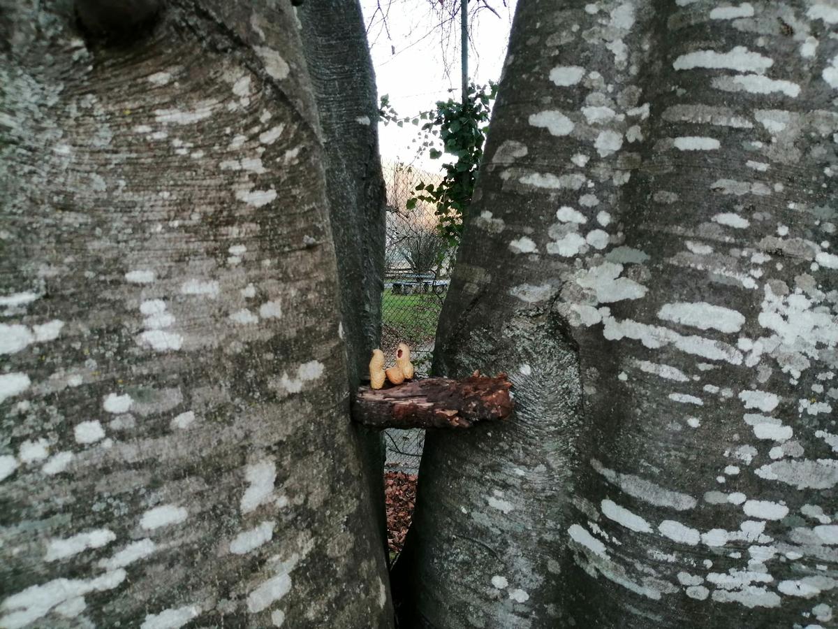 Aquí podéis ver uno de ellos. Pusimos los cacahuetes encima de una corteza y lo pusimos en el hueco de dos ramas.