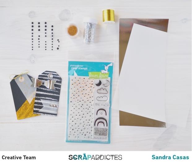 Los materiales que he usado para realizaros y decorarlos: papel vellum, papel metalizado plata, sellos, purpurina y perlas negras.