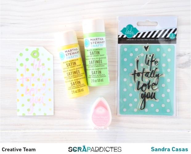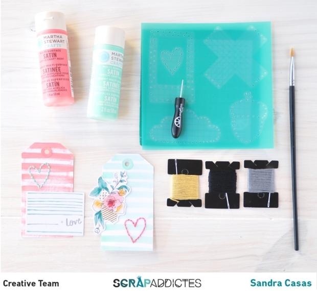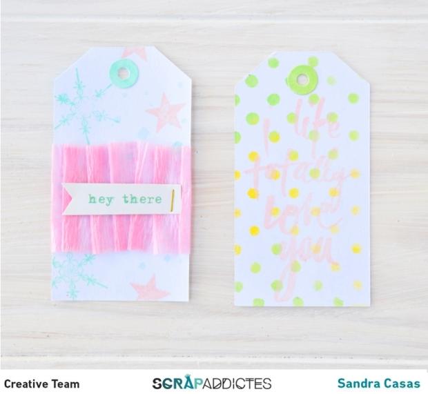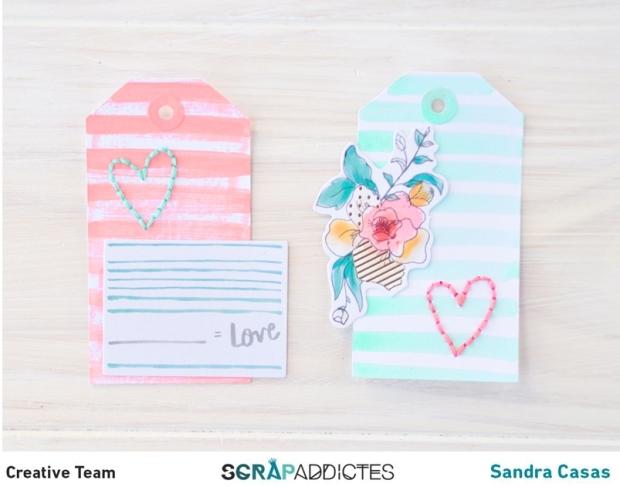 Estas etiquetas están creadas bajo una base de cartulina blanca en la que he pintado con acrílica de color unas líneas con el pincel cuadrado. Son muy sencillas pero quedan chulísimas al decorarlas y además son muy rápidas de hacer. Aparte con una de las plantillas de Amy Tangerine he cosido un corazón y le he puesto un adornito también de la colección Stitched, pero las opciones son infinitas.