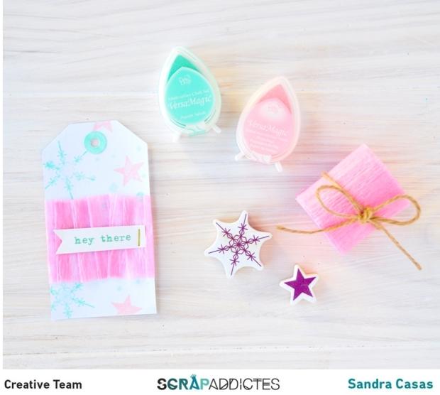 En la primera he troquelado una cartulina blanca y he estampado estrellitas en dos colores: rosa y verde agua. Para decorar una tira de papel crepé y un recortable.