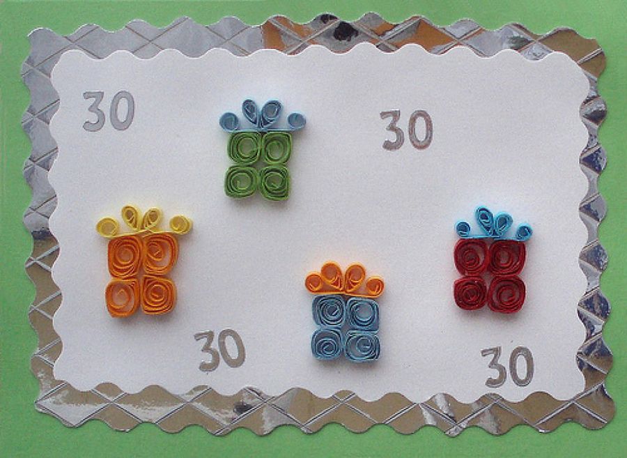 Ahora vemos una perspectiva algo más original, basada en papelitos recortados y doblados de tal manera que crean formas circulares muy agradables. Esta tarjeta da sensación de movimiento y atraería mucho la mirada de los pequeños. Los elementos, incluidos los números que indican la edad, pueden hacerse con papel normal o cartulina.