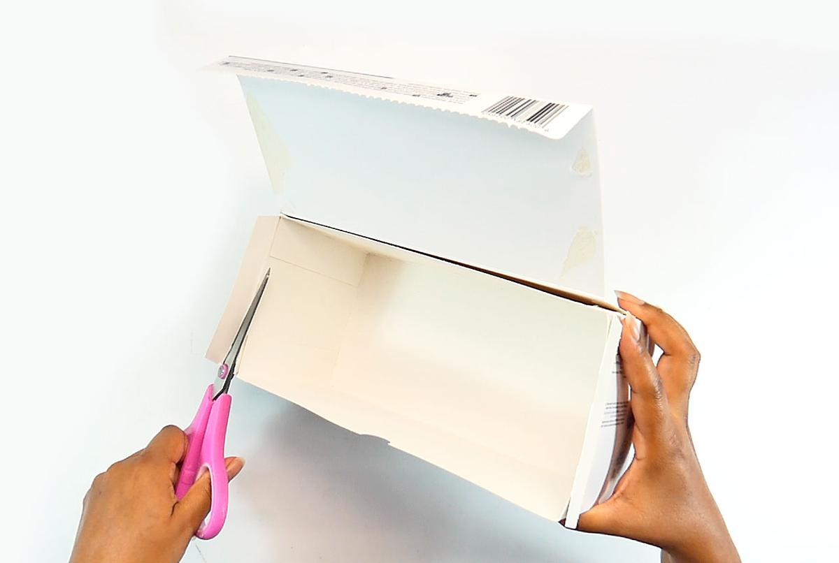 Puedes utilizar cualquier caja de cartón, según la medida que necesites, recortar todas las pestañas y la tapa, abrir la caja.