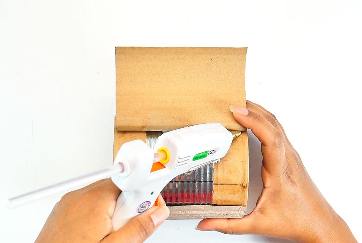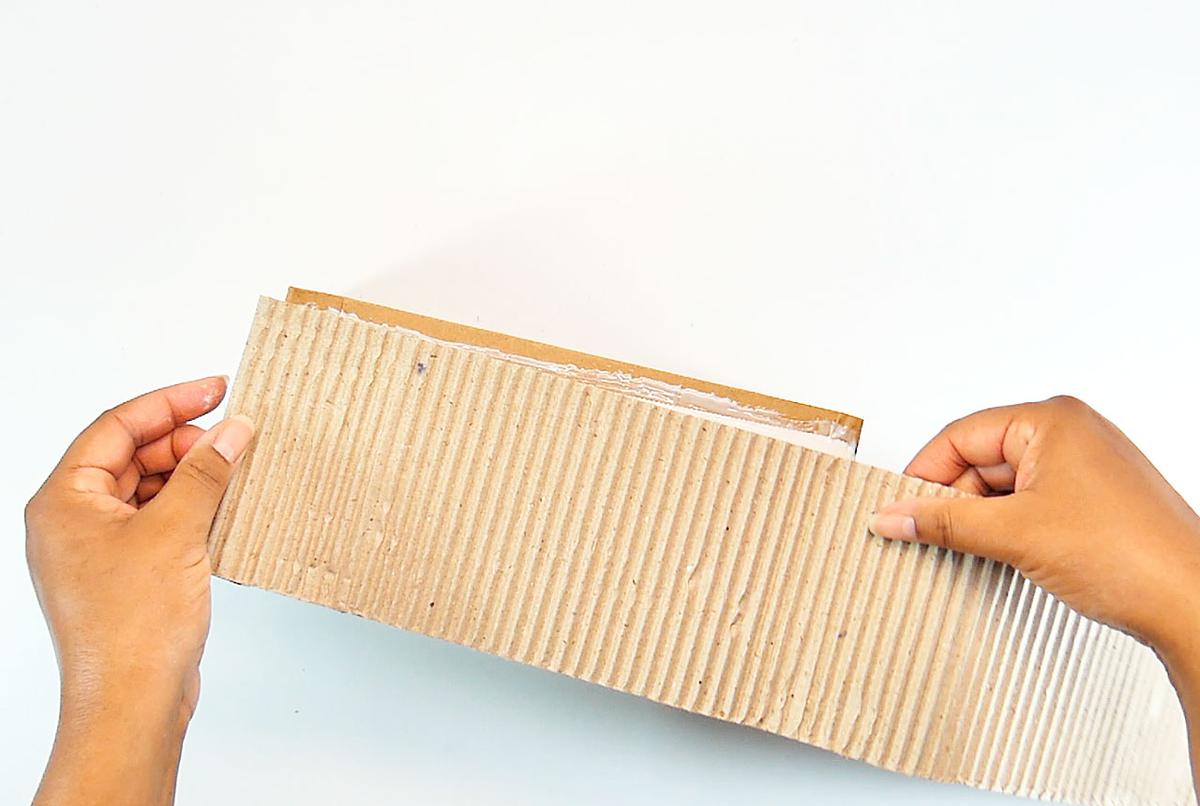Cortar una tira de cartón corrugado a la medida del alto de la caja y pegar en la parte exterior cubriendo toda la caja.