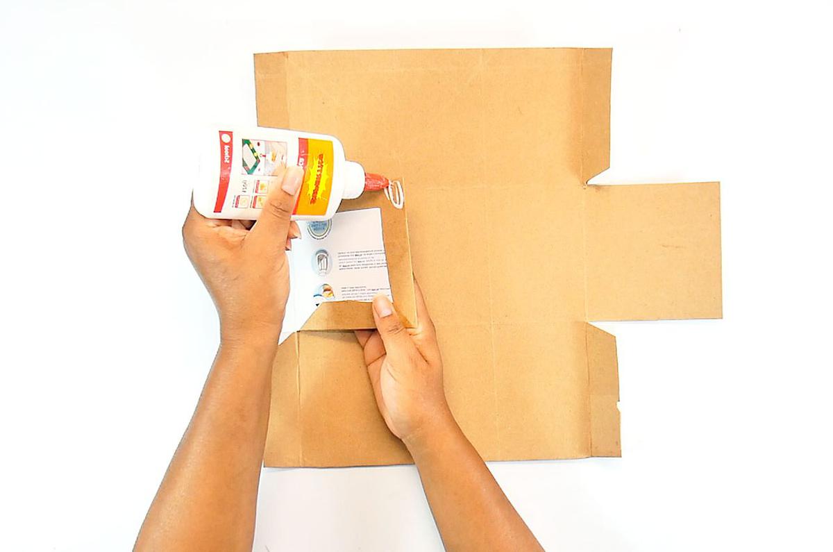 Pegar por el lado interior papel kraft o papel de bolsa. teniendo cuidado de cubrir también los cantos de la caja.
