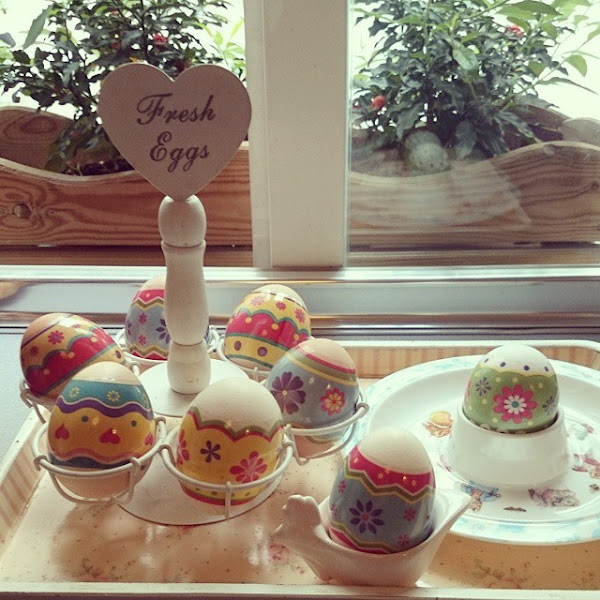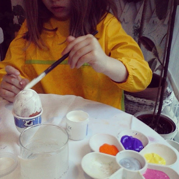Imágenes mías de huevos decorados por nosotras y mi nena pintando: