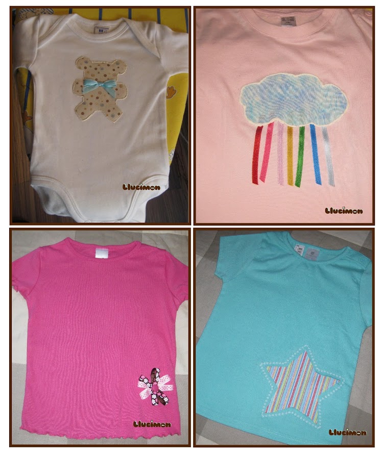 - La segunda es una camiseta para niños, la idea la saqué de un broche de fieltro que vi con la forma de la nubecilla y las cintas colgando como arcoiris. La técnica es la misma que en el body: colocar los trocitos de cintas de raso que formarán el arcoiris primero sobre la camiseta (os aconsejo engancharlos con una aguja o con un punto de bastilla para que no se muevan al añadir la nube), después pegar el retal de tela azul cortado en forma de nube con fliselina adhesiva sobre el arcoiris, fijar los bordes de la nube con la pintura textil y planchar... En este caso las cintas arcoiris quedan sueltas por debajo, sólo enganchadas por la parte superior, y sabemos que corremos ese riesgo dependiendo de la edad del peque... a la mía le encantó pero tampoco se pasaba mucho dando tirones, ahora que si sabes que el usuario no va a parar quieto hasta que consiga arrancarlas, quizás puedas plantearte el coserlas a lo largo...