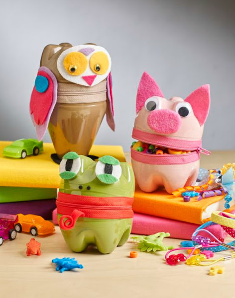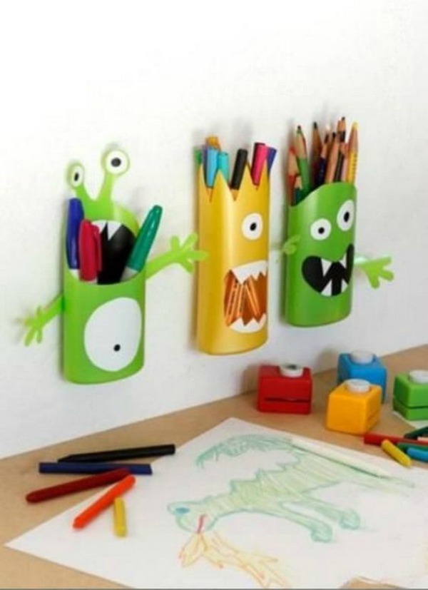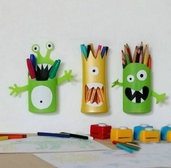Si hay enseres que tanto tú como los peques de la casa necesitáis tener almacenados pero bien a mano, reciclar botellas te ayudará de la forma más original a conseguirlo. Y es que con un poco de imaginación podrás dar lugar a las composiciones más divertidas y prácticas con el simple hecho de dar una segunda oportunidad a ciertos envases que tienes por casa. Y si no, fíjate en la "monstruosa" forma de conseguirlo que te muestro a través del siguiente ejemplo.