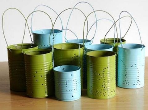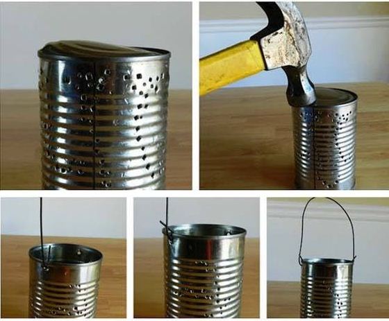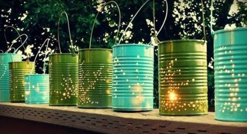 Mete dentro de las latas unas velitas y cuelga tus lamparas :).
