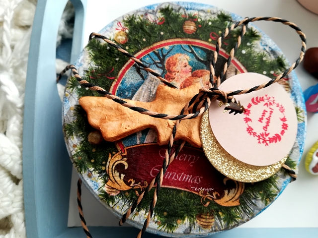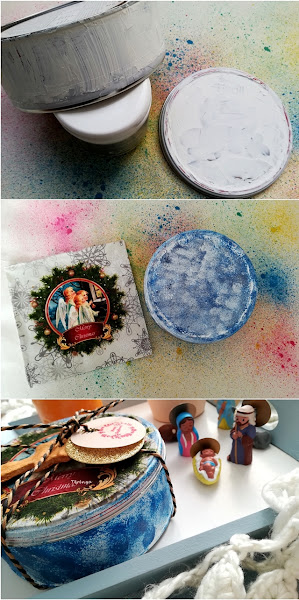 Después de limpiar y secar la caja le di una mano de gesso para eliminar todo tipo de publicidad. Cuando estaba seco, la pinté de blanco primero y azul después, y cogí una de las fabulosas servilletas con temática de navidad que compré en la feria creativa.