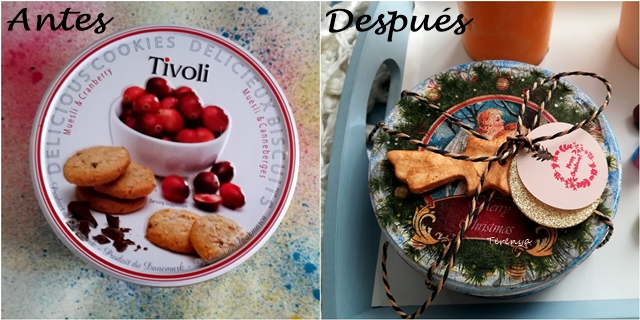 La verdad es que no he tenido mucho tiempo de prepararte muchas cositas así que, mi propuesta es una sencilla caja de galletas de estas de latón que apareció un día en mi trabajo y que una vez vacía, nos peleábamos por quedárnosla.... qué bien van estas cajas para llenarlas de cositas, ¿verdad?