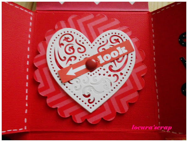 El corazón del medio lleva un circulo festoneado de big shot en relieve, un corazón de picadillo que compre el holamama , una etiquetita de un papel de scrap y un brad para que pueda girar esa flecha.