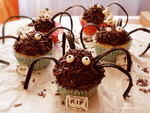 Si vas a realizar una fiesta de de Halloween es imprescindible contar con un postre que sea el centro de atención a la hora de la cena, y para cumplir con éste reto el blog Una Pizca de Hogar nos sugiere realizar estos cupcakes terroríficos y a la vez muy tiernos con decoración de araña. La receta del bizcocho lleva harina, levadura, sal, mantequilla, azúcar, huevos, vainilla, leche y el característico sabor de la ralladura de un limón. Como ven los ingredientes no salen fuera de lo común y seguro que la mayoría los tienes en casa por lo que es una excelente opción para ésta noche, pero además del pan también nos enseñan a hacer la decoración la cual involucra cobertura de chocolate, leche y fideos de chocolate (¿verdad que suena chocolatosamente delicioso?). Y si quieres ver el procedimiento y conocer más detalles puedes hacerlo dando click aquí.