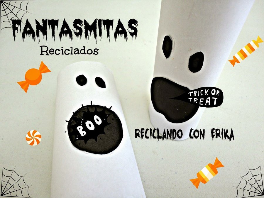Fantasmitas con tubos de cartón. Otra opciónsimilar a la anterior son estos simpáticos fantasmas hechos también con tubos de cartón. Puedes usar ambos para dar en tu fiesta o hacerlos en compañía de tus pequeños, los dos son excelentes opciones y llevan materiales muy similares, así que se acompañan perfecto. Los fantasmas que nos sugiere el blog Reciclando con Erika llevan los siguientes materiales: tubos de cartón, hojas blancas, papel construcción negro, pegamento, tijeras y un lápiz para ayudarnos con los trazos. Erika ha ilustrado el paso a paso una serie de fotografías que nos facilitarán mucho más el proceso, el cual puedes ver haciendo click aquí.