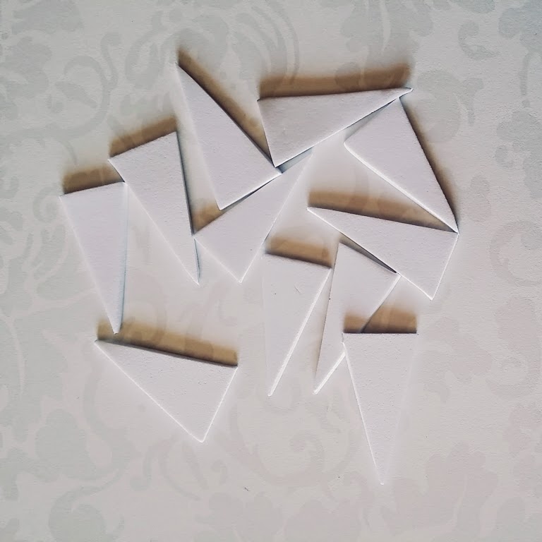 Con ayuda de la regla dibujamos una recta y dibidimos por cm y cada 2 cm recortamos triangulos como ves en la foto son de 2 cm de ancho por 4 cm