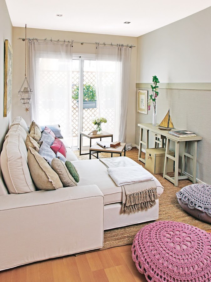 Es un salón pequeño, pero cuando se decora con gusto y sencillez, se convierte en un espacio muy acogedor y con sello personal. Fijaros bien en los puff redondos del suelo: sencillamente alucinantes! Son lo último de la moda: "El ganchillo gigante". Animaros!
