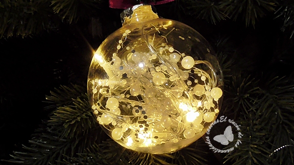 Para la otra bola, como la abertura que tenía era muy pequeña no le podía meter casi nada, así que decidí iluminarla con una tira de luces leds con perlitas. La cajita donde van las pilas la podemos ocultar entre las ramas del árbol, le puse un lacito y así de rápido y fácil la tengo lista.