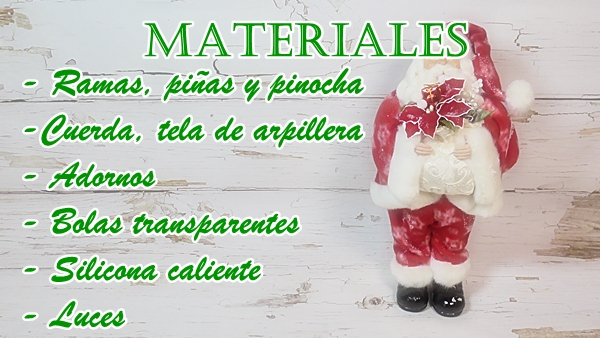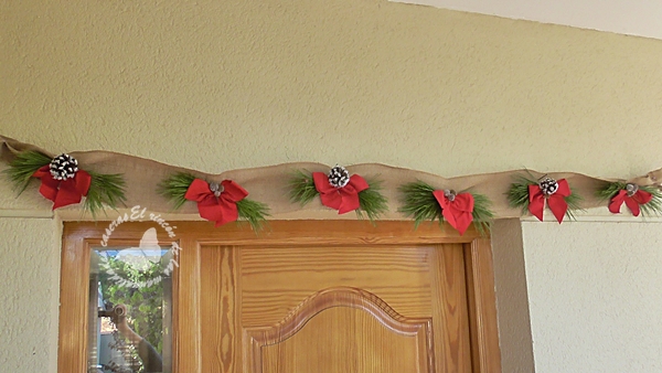 Para la guirnalda, como base he usado una tira larga de 2 m. de tela de arpillera, y con pinocha de los pinos he hecho unos ramilletes. Para poder usar la tela en otras ocasiones he decidido coserlo todo, pero podéis usar silicona caliente. Colocamos en el suelo la tela y vamos colocando los ramilletes en su posición, yo he hecho 6 ramilletes, los cosemos en su sitio con un par de puntadas, le colocamos unos lazos y por último unas piñas u otras semillas que podamos recoger, así de fácil tenemos la guirnalda. Yo la he colocado en el exterior, pero si la ponéis dentro de casa, huele a monte, es una gozada.