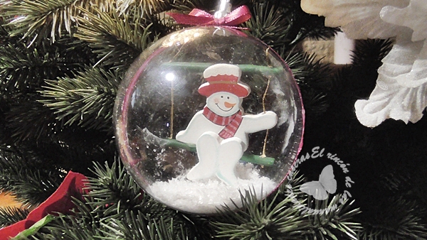 Y vamos de fácil a más fácil jajaja, solo necesitamos unas bolas transparentes y decorarlas, yo he usado dos clases de bolas, las que se abren por el medio y la que solo tiene un agujero en la parte de arriba. Para la primera le he colocado un muñeco de nieve con columpio jajaja así tiene movimiento y queda muy gracioso, y le he añadido un poco de nieve artificial. para asegurarme que no se abra le he pegado alrededor de la abertura una cinta y listo.