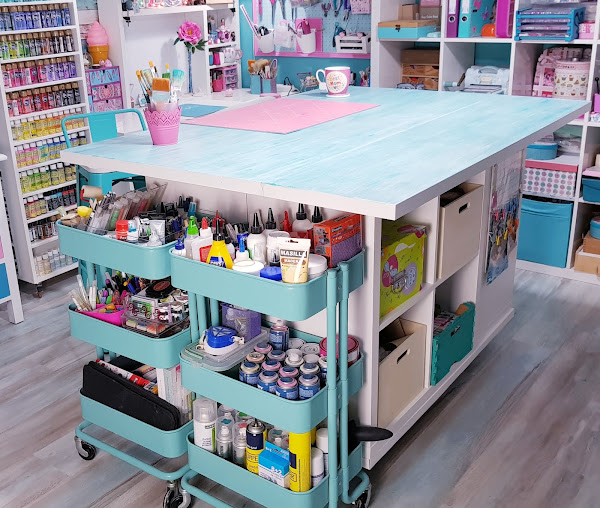 Otra de las cosas que tenía súper claras era, que quería disponer de una isla o mesa central de trabajo que fuera bastante amplia y además alta, para el tema de impartir talleres, los trabajos que requieren de más espacio y para los que requieren trabajar de pie, ya que en el anterior taller cuando hacía algunos trabajos de pie acababa arriñonada, así que me puse manos a la obra y realicé mi propia isla de trabajo, os dejo aquí el enlace para que podáis ver el tutorial.