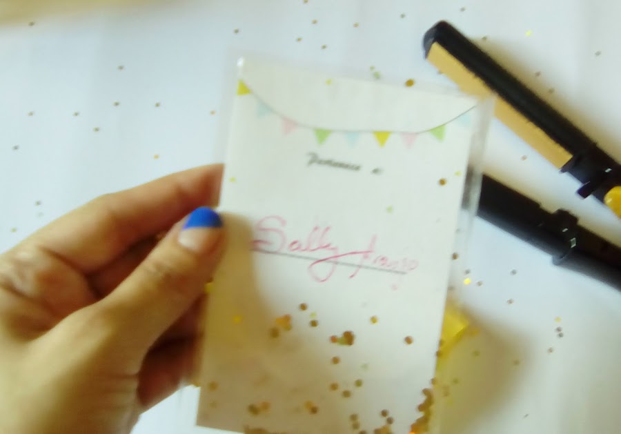 Pasa la plancha por todo el borde dejando la parte superior abierta. Coloca el confeti y luego cierra con la plancha (No olvides el papel de ceda)