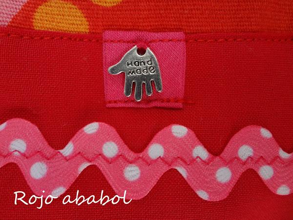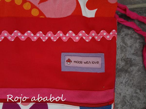 Para la rosa detalles a tono. Etiqueta rosa sobre bies lila, zigzag topeado rosa, y bies para tapar la cremallera también en rosa.
