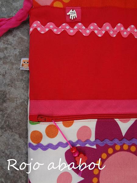 Debajo de la cremallera otro zig zag, esta vez lila. Manita, búhos y bolitas decorando la cremallera con los tonos de la mochila.